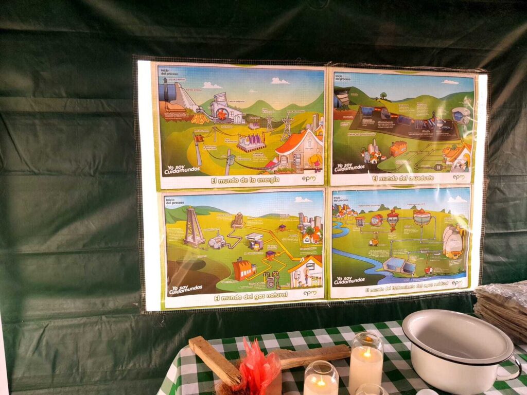 La explicación gira en torno a la comparación de la época antigua y de nuestros días. A los niños, «les estamos contando cómo era antes «que la gente tenía que levantarse ir a la quebrada o al río para recoger el agua y llevarla a la casa para cocinar los alimentos, para hacer el aseo personal y del hogar; y como eso se fue transformando en la medida que nace una empresa que empieza a llegar a nuestros hogares con el acueducto, con el alcantarillado, con la energía y con el gas natural; los servicios públicos para la calidad de vida», nos cuenta Eliana. Todo eso lo explican a través de unos juegos, de unos afiches donde se tienen plasmados cada uno de los pasos de los procesos. Así nos damos cuenta de todo el esfuerzo que hay cuando se abre una llave para obtener el agua o al apretar un suiche que enciende la luz.