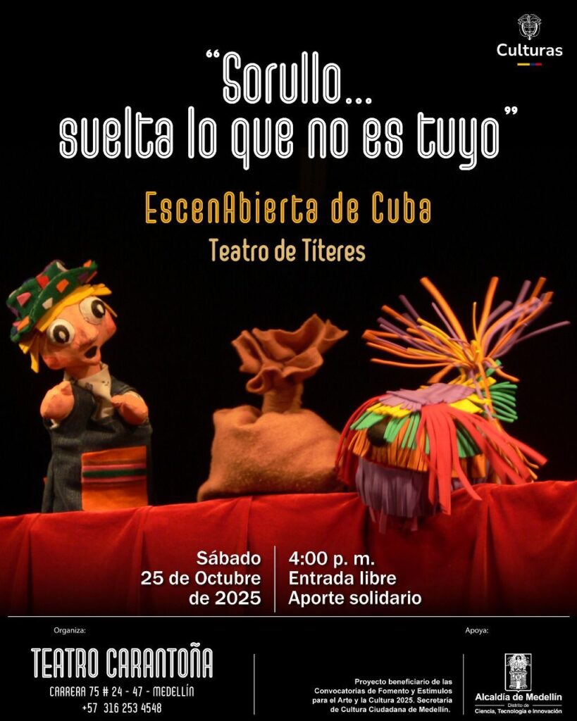 Desde Cuba, llega a nuestra sala Javier y Sorullo, con una historia de títeres llena de humor, música y frutas traviesas 🍎🍊.