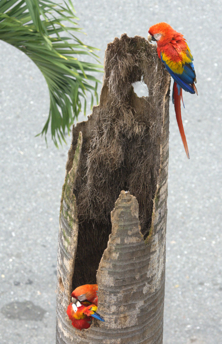 El punto focal fue una palma muerta de gran altura, la estructura (profundidad, materiales internos, diámetro) del nido se desconoce, debido a su estructura profunda dificultó inicialmente la observación directa de una posible anidación, y más teniendo en cuenta que esta especie puede durar meses en escoger el nido ideal. Durante seis meses se documentó la actividad constante de los individuos adultos en la periferia y en el interior de dicha estructura, visitándola constantemente, a veces un individuo, otras veces bandadas de hasta 8 individuos venían a visitar el entorno.